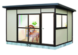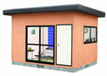横張りスチールサイディングの外壁です。外壁にはウレタン、グラスウールとダブル効果の断熱材を内蔵しました。3〜20帖までのサイズを揃えました。